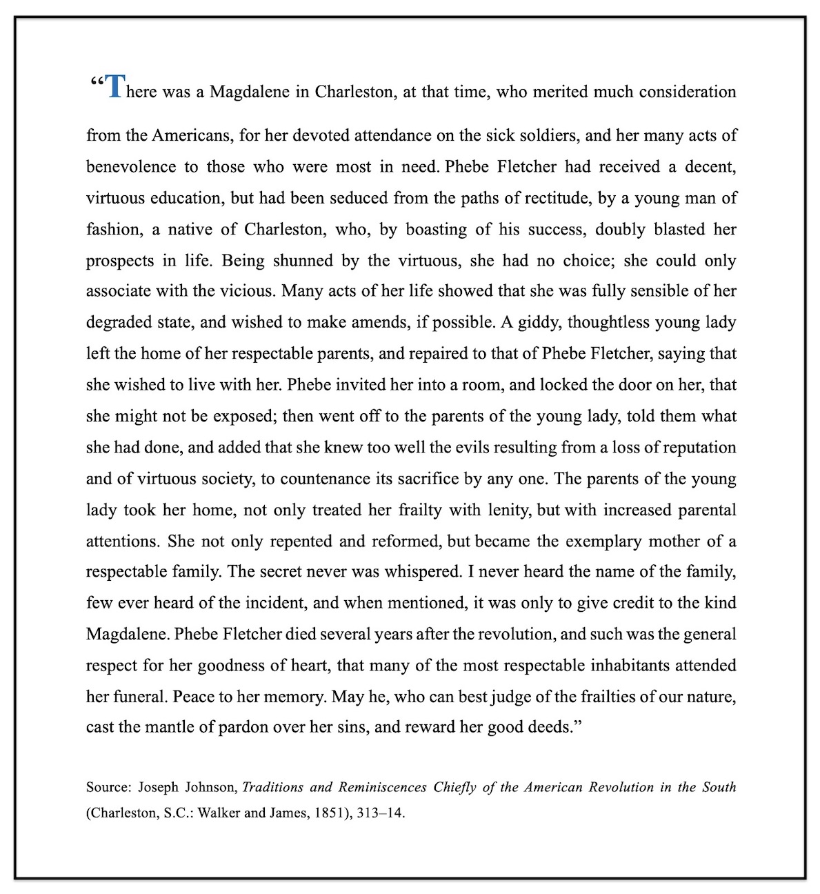 Joseph Johnson revived the memory of Phebe Fletcher in 1851 as a sidelight to the sprawling and complex struggle for American Independence. More precisely, he couched her brief biography within a discussion of the harsh treatment of American soldiers after the British Army captured the former capital of South Carolina in May 1780. “There was a Magdalene in Charleston, at that time,” wrote Johnson, “who merited much consideration from the Americans, for her devoted attendance on the sick soldiers, and her many acts of benevolence to those who were most in need.”[4] Because the author was just four years old when British forces commenced their oppressive occupation of the capital, he likely learned of Phebe’s memorable acts from older eye-witnesses in the post-war years. Among the most likely sources was Dr. Johnson’s own father and his brothers-in-arms, who might have personally received comfort from the young Magdalene.
