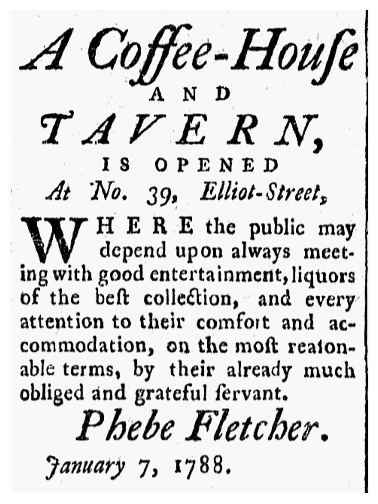 In January 1788, Phebe Fletcher advertised that she had opened a “Coffee-House and Tavern” at a site then identified as No. 39 Elliott Street, “where the public may depend upon always meeting with good entertainment, liquors of the best collection, and every attention to their comfort and accommodation, on the most reasonable terms.”[11] Three months later, however, she sold a significant quantity of “household goods” to an obscure mariner named John Magnall. Whether this transaction represented the liquidation of Phebe’s business, or the division of property with a departing partner, is now unknown. At any rate, the surviving bill-of-sale provides a valuable snapshot of her private chambers. For £30 sterling, Fletcher sold (with the original spelling) “one featherbed two mattrasses, one bedstead, one lott [of] fifteen windsor chairs three blankets three deal tables, one Dutch table three mahagony tables seven pictures one commode, one looking glass one trunk of cloaths nine boxes one bar ten iron potts two stew pans, two dozen plates one dozen knives & forks, four tubs one cooler one pail two pair of iron dogs, ten tumblers two decanters two fish dishes one sett of Chaina one dozen of wine glasses three window curtains four candlesticks and a pair of silver sugar tongs and five silver tea spoons.”[12]