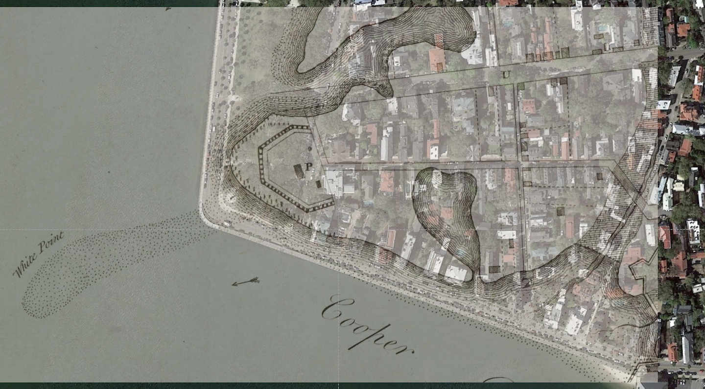 So, if the prescribed legal setting for the execution of pirates was indeed observed here in Charleston in 1718 (and we have no reason to suppose it was not), we can conclude that Stede Bonnet and his crew, as well as the remnants of Richard Worley’s crew, were all hanged at the extreme southeasternmost point of the White Point, on the beach between the ebbing and flowing of the tides. Due to the paucity of extant surveyors’ records from that era, however, it’s practically impossible to determine the exact location of the high and low water marks at White Point in 1718. The present-day topography of that site is remarkably different from its appearance three hundred years ago. From the construction of Broughton’s Battery in the mid-1730s, through the addition of further fortifications in the 1750s and 1760s, then the leveling of the site after the American Revolution, and then several sustained episodes of filling and expansion from the late 1830s through the early 1850s, the geographic boundaries of the dry land at White Point have increased dramatically over the past three centuries. In the text version of today’s episode, I’m including an image that overlays a portion of the 1739 “Ichnography of Charles-Town” on a Google Earth image of present-day White Point. As you can see in that composite image, the water, land, and “intertidal zone” are all shaded differently in the 1739 map, which allows us to form an educated guess about the possible legal location of the hanging of forty-nine pirates in 1718.