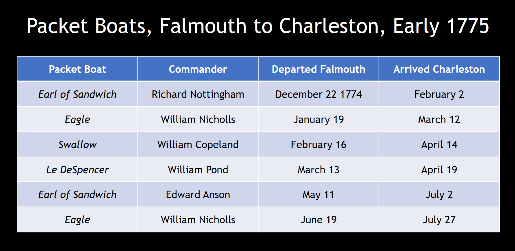 Their waiting wasn’t simply open-ended or vague. Rather, there was a relatively predictable timetable for the arrival of the information they desired. Official news from London travelled to North America on a monthly schedule by way of a pair of government-sponsored packet boat fleets (for more information on this topic, see last week’s essay). The northern branch included five packet boats that took turns sailing a monthly route from Falmouth, on the southwest coast of Cornwall, directly to New York. There the postmaster separated the official mail packets for each the northern colonies and handed them to post riders who carried them north to the New England colonies and south to the mid-Atlantic colonies. The southern branch of this maritime postal system included four packet boats that took turns sailing a monthly route from Falmouth directly to Charleston, where our postmaster likewise separated and distributed the official mails for North Carolina, Georgia, and East Florida. In the early months of 1775, therefore, all American eyes looked to New York and to Charleston for the arrival of the monthly packet boat carrying the latest official news of parliamentary actions.