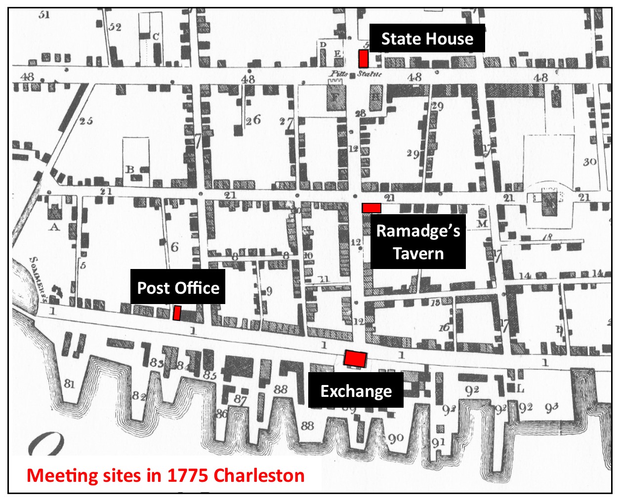 Shortly after the arrival of the Swallow on Friday, April 14th, a number of members of the Charleston General Committee [at least twenty-one members] were preparing to gather for their regular weekly meeting on Wednesday afternoon, April 19th, at Charles Ramadge's tavern at the northeast corner of Broad and Church Streets. The S.C. Commons House of Assembly, the legitimate government body that included most of the members of the General Committee, was scheduled to reconvene on Thursday, April 20th, and the men wanted to discuss the latest bad news from England and to coordinate their political strategies. “Scarcely had they assembled,” wrote John Drayton, “when they were informed the British packet had arrived; and was come to an anchor. The [General] Committee therefore adjourned, until the next day; that in the meantime, the intelligence received by her [the packet], might be known, and digested” (Drayton, Memoirs, 1: 218–19).