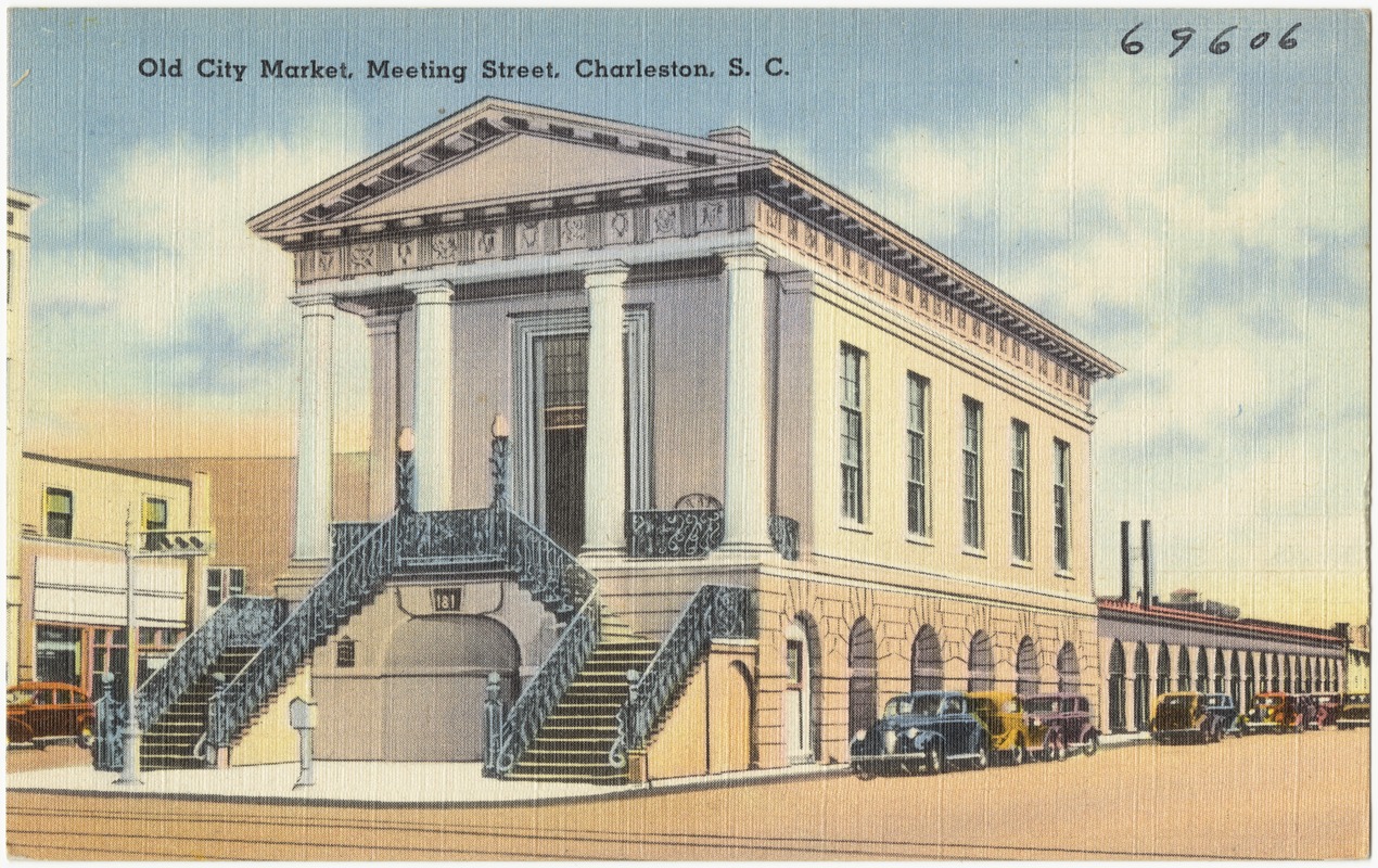 Most conversations about Market Hall, whether published in glossy books or delivered by passing tour guides, tend to focus on the building’s architectural features and its relation to adjacent surroundings. The two-story hall casts a long shadow over the City Market in Market Street, where many generations of Charlestonians purchased their daily provisions like vegetables, fruits, and fresh meat in the days before refrigeration and supermarkets. Raised high above the humble market sheds, the massively elegant and classical lines of Market Hall seem oddly out of step with the daily vending of foodstuffs that once dominated the cobbles of North and South Market Streets. To put this building in its proper historical context, therefore, we need to travel back in time to explore the origins and purpose of this misunderstood Market Hall.
