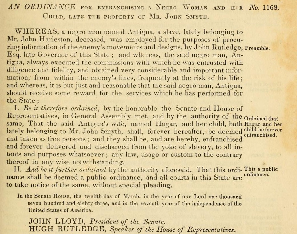 Another remarkable story of public manumission in early South Carolina is rooted in the American War of Independence. When the British Army had captured Charleston in 1780, Governor John Rutledge fled northward into North Carolina with a military escort that included Major John Harleston. Harleston brought along an enslaved man named Antigua, who aided the American cause by infiltrating British camps and collecting valuable intelligence. Following Major Harleston’s death in Virginia in the spring of 1781, Governor Rutledge personally manumitted or freed Antigua on behalf of the state as a reward for his work as an American spy. Then the governor asked Antigua to undertake another dangerous mission—to infiltrate occupied Charleston and pass information to the American forces outside the city. The spy asked for a further reward, and Governor Rutledge promised to free Antigua’s wife and child at a later date. Antigua tried to sneak into British-held Charleston, but was captured and detained. At the end of the war, in early 1783, former governor John Rutledge asked the current governor and the state legislature to honor his promise to Antigua. Accordingly, on March 12th, 1783, the South Carolina General Assembly ratified an ordinance to manumit a “Negro woman” named Hagar and her child, as a “reward for the services which [her husband, Antigua,] has performed for the State.”[12]