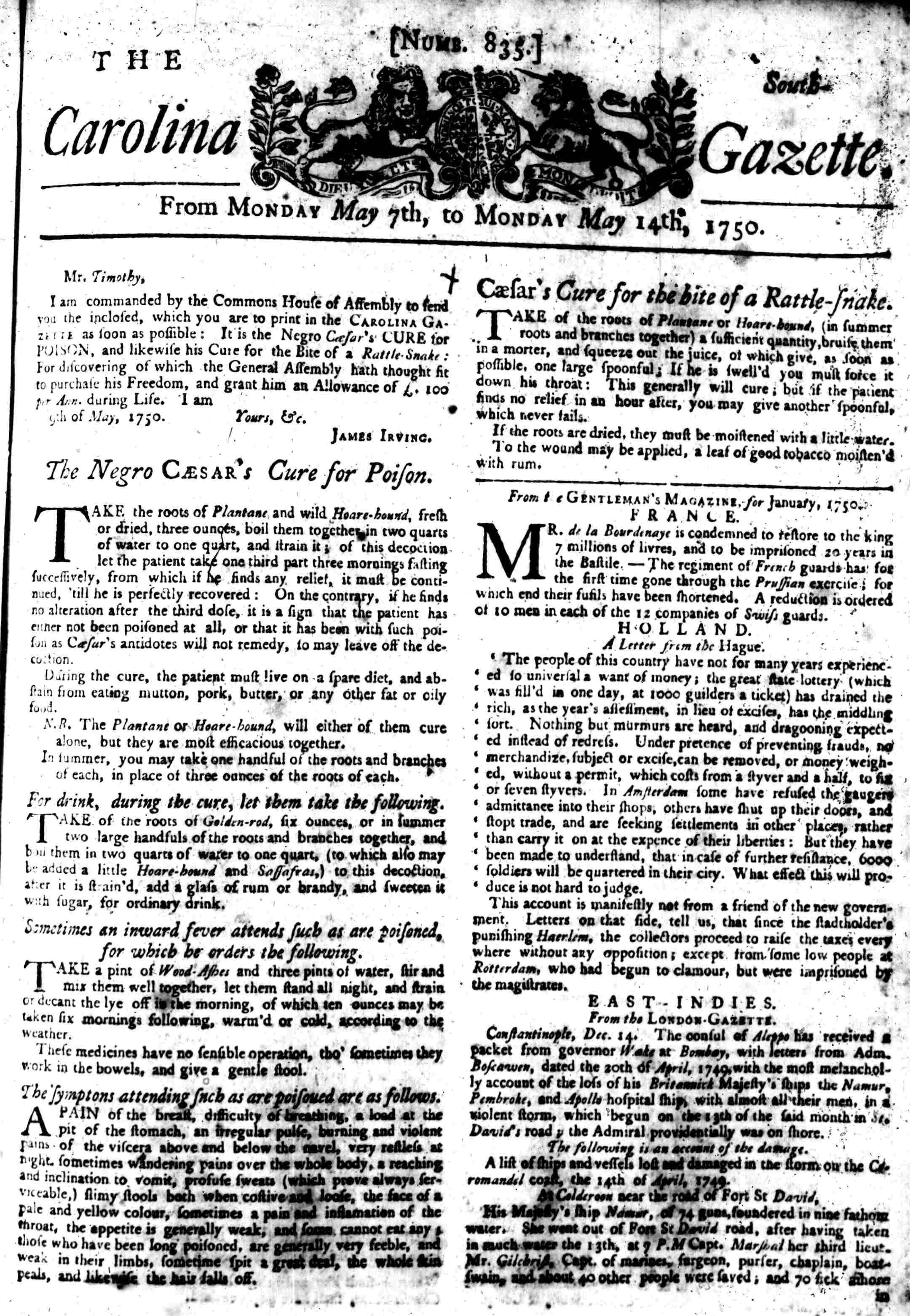 A May, 1750 edition of the SC Gazette advertising Caesar's cure for the rattlesnake bite.