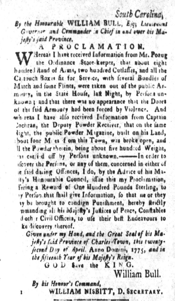 [15] The earliest surviving copy of Bull’s proclamation appears in South-Carolina Gazette and Country Journal, 25 April 1775 (Tuesday).