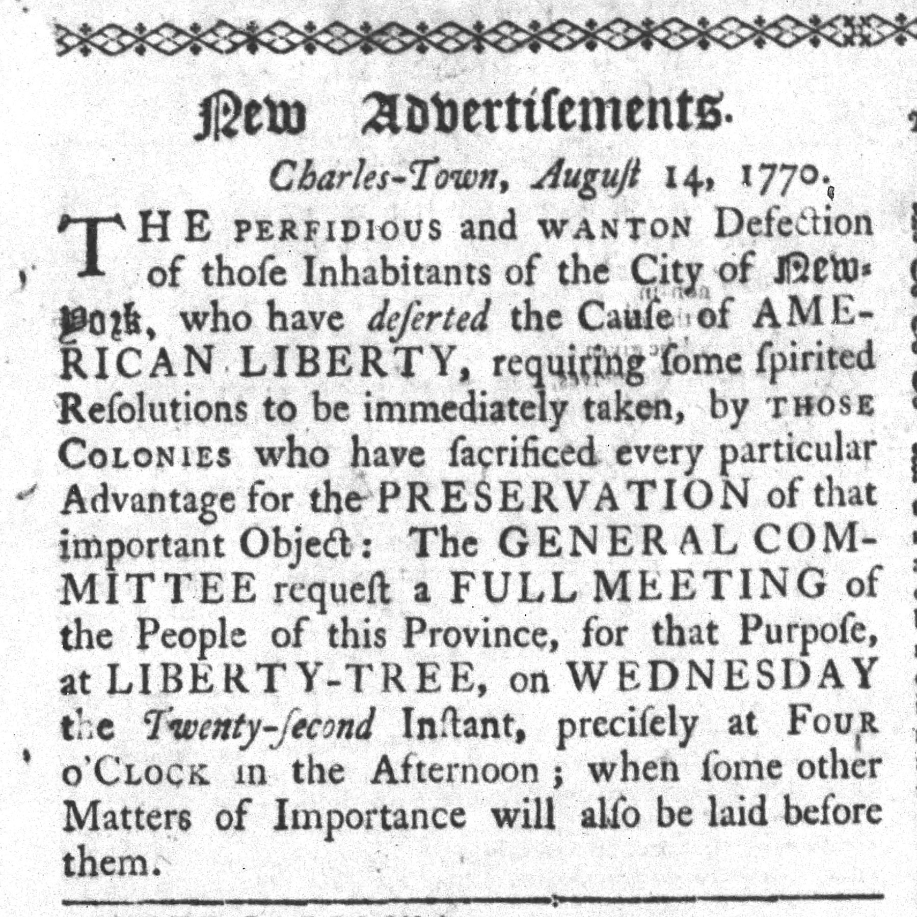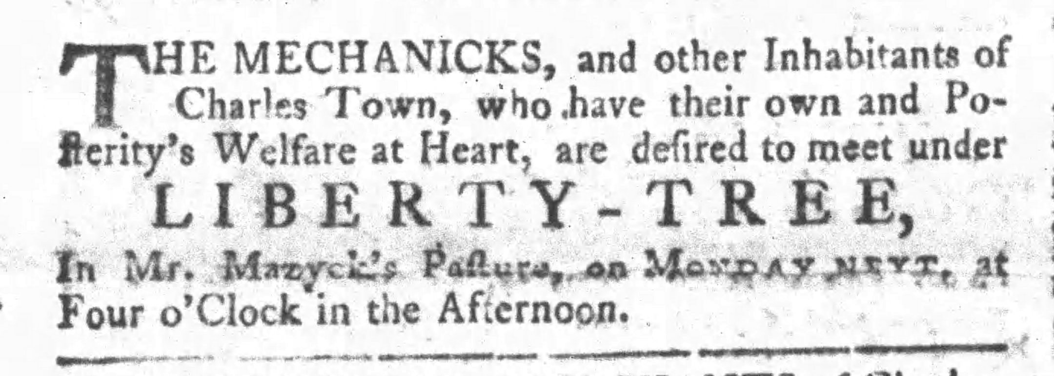Charleston’s Liberty Tree, adopted by the local mechanics as their gathering place in 1766, entered a more public phrase of its career with the celebration of October 1st, 1768. In the ensuing twelve years, Liberty Tree was the venue for a number of important meetings, both formal and informal, where men debated the means of preserving American liberties within the context of British rule, and later debated the path towards securing American independence from Britain. Some of these outdoor meetings were advertised prominently in the local newspapers, while some were reported only after the fact, and some not reported at all. The extant Charleston newspapers provide few details about such events because local readers generally heard such news through word of mouth, while at the same time relying on the press to relay information about Liberty Tree activities in other communities farther away. It’s difficult, if not impossible, therefore, to create a robust timeline of activity at Charleston’s Liberty Tree and a roster of its visitors.