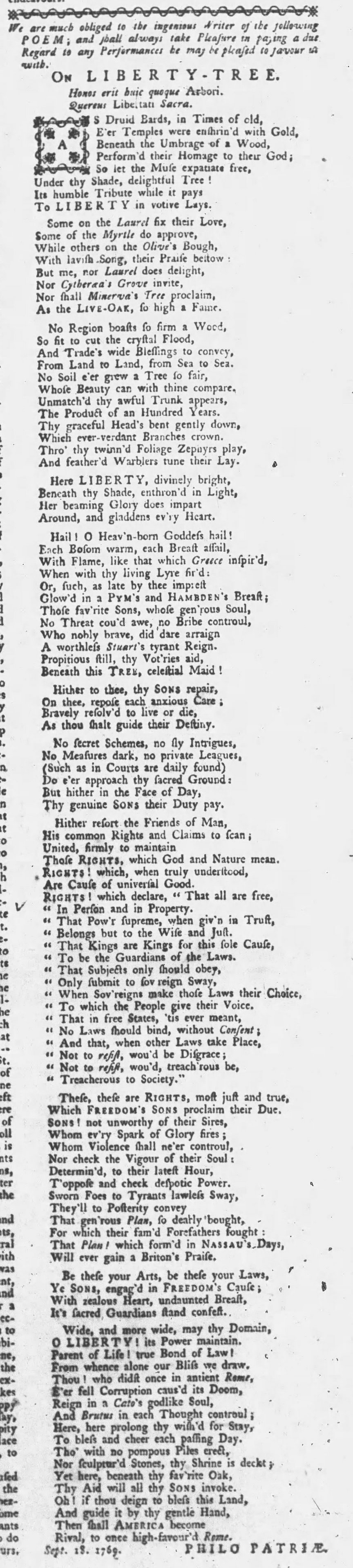 [11] The text of the “General Association” appears on the front page of SCG, 27 July 1769, while the description of the meeting appears on page two; the poem, “On Liberty-Tree,” appears in SCG, 21 September 1769.