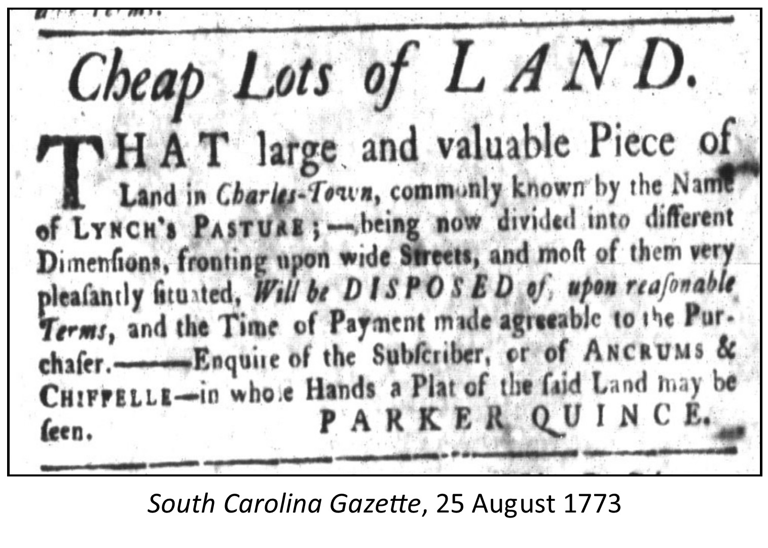 Beginning in late 1773 and continuing for more than a decade, you can find numerous newspaper advertisements for the sale of lots in this new subdivision that lacked a name. If you search through the old Charleston newspapers looking for post-1773 references to Rhettsbury or Rhett’s Point, you’ll be disappointed. Most of the advertisements I’ve seen for this property simply mention the sale of building lots fronting on newly-created streets. When they do mention a place name to help you locate to site, it’s usually called Lynch’s Pasture. In the years following the American Revolution, it seems, the names Rhett, Trott, and Lynch quickly faded from Charleston’s collective memory.[12]