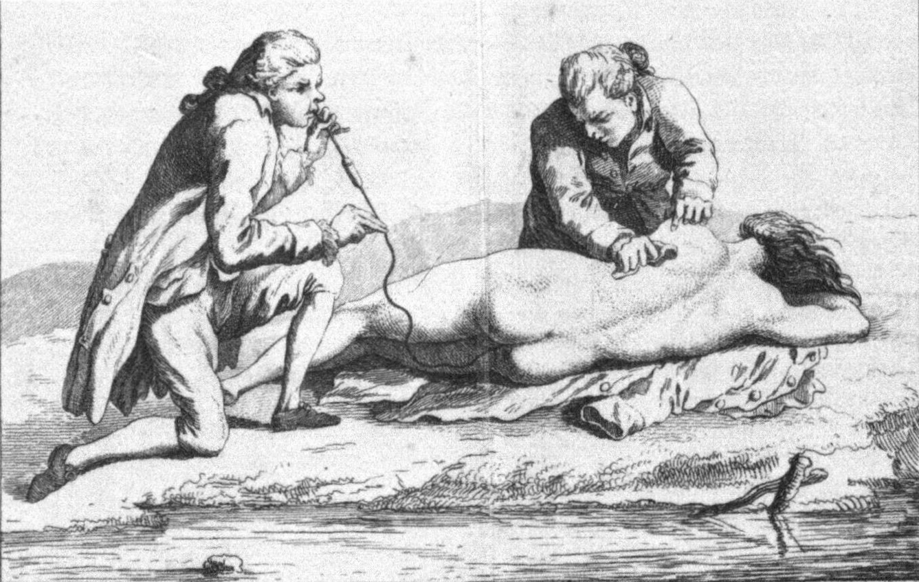 One could fill a dissertation with details of the reanimation methods advocated during the 1780s. At the risk of oversimplifying this complex topic, I’ll reduce the field to four principal strategies. The first involved the application of heat to cold bodies by wrapping them in blankets, placing them in warm beds with naked companions, or surrounding them with warm bricks and bladders of hot water. Second, rescuers were encouraged to rub vigorously the skin of apparently-dead bodies, especially around the heart, to excite the flesh and organs. For reasons not entirely clear, the leading practitioners of this science advocated the use of flannel cloths and spiritous liquors to enhance the excitation of the victim’s skin.