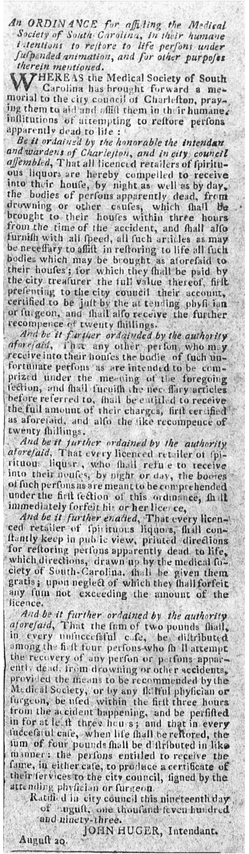 Five days later, on Monday, the 19th of August, 1793, the members of Charleston’s City Council ratified “An Ordinance for assisting the Medical Society of South Carolina, in their humane intentions, to restore to life persons under suspended animation.” Citizens became aware of the new law the following morning, when Charleston’s principal newspaper of that era, the City Gazette, printed the full text without any sort of commentary or reaction. After appearing in multiple editions of local papers printed during the autumn of 1793, the ordinance later appeared in several compilations of city laws printed in the late 1790s and early 1800s. These documents provide modern readers with the outline of an intriguing story, but leave many questions unanswered.