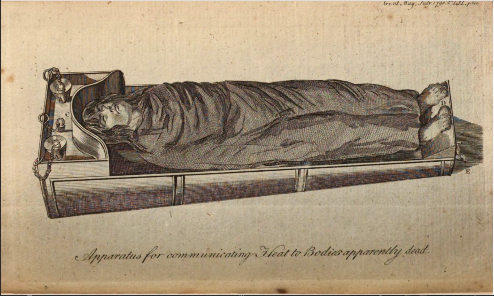The plan announced by the Medical Society of South Carolina was contemporary with a new development in life-restoring technology in England. A physician working in the port town of Lancaster developed an “apparatus,” which had been exhibited to and endorsed by the Royal Humane Society of London. In the summer of 1790, the popular Gentleman’s Magazine of London printed an illustration and description of this “very ingenious and useful apparatus for the communication of heat to bodies apparently dead.” The “machine” in question was a hollow box, probably made of sheets of tin, measuring five and a half feet long and bearing a strong resemblance to a coffin. Instead of placing a body inside its walls, however, the apparently-dead body was placed on top of the device between molded rests for the head and feet. A pair of funnels above the head allowed users to fill the apparatus with hot water, while a spigot below the feet allowed them to drain the water after use.[7]