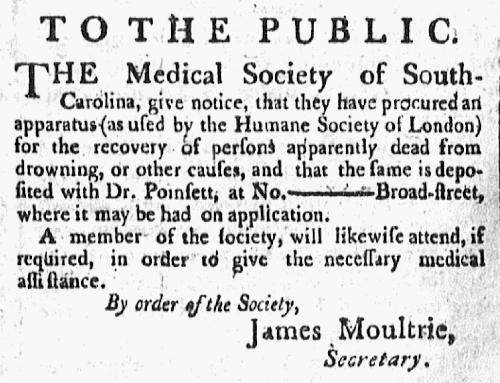 Two weeks later, two of Charleston’s daily newspapers printed the following public notice that appeared in multiple issues in late May 1793: “The Medical Society of South Carolina, give notice, that they have procured an apparatus (as used by the Humane Society of London) for the recovery of persons apparently dead from drowning, or other causes, and that the same is deposited with Dr. Poinsett, at No. — Broad-street, where it may be had on application. A member of the society, will likewise attend, if required, in order to give the necessary medical assistance.”[10]