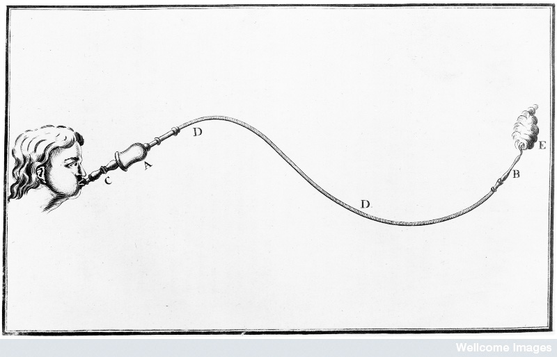 Third, it was thought necessary to inflate the internal organs. Bellows inserted into a nostril could be used to pump air into lifeless lungs—a task that could also be done with one’s mouth over the victim’s mouth if bellows were not available. To inflate and excite the bowels, most of the leading scientists of the late eighteenth century advocated the use of an older technique used to treat a wide variety of ailments. In the parlance of that era, physicians were directed to deploy tobacco smoke “in the enemetic form”; or, in another choice phrase, “to throw tobacco smoke gently into the fundament.” That’s right, were talking about the once-popular tobacco smoke enema. Using a tube connected to a pipe, glyster, bellows, or other apparatus, rescuers believed that the pungent herbal smoke would stimulate the bowels into performing their natural functions.[4]