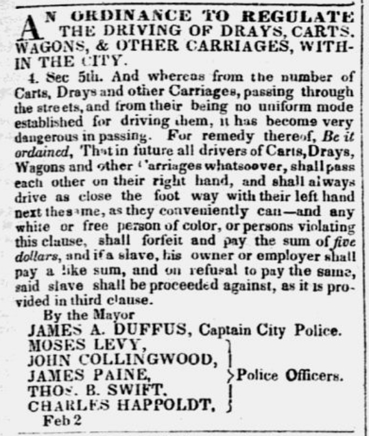 “And whereas, from the number of carts, drays, and other carriages, passing through the streets, and from there being no uniform mode established for driving them, it has become very dangerous in passing, for remedy thereof, Be it ordained by the authority aforesaid, That in future, all drivers of carts, drays, wagons, and other carriages whatsoever, shall pass each other on their right hands, and shall always drive as close [to] the foot-way, with their left hand next [to] the same, as they conveniently can.”