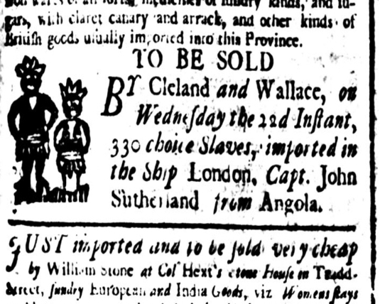 It’s unclear to me, however, whether a customer hoping to purchase enslaved people was obliged to climb aboard the vessel in question to view the available stock, or stood on the wharf next to the vessel and watched its crew parade the enslaved people across the deck. I suspect that both options were possible, depending on the size of the vessel and the number of people being offered for sale. It’s also unclear to me whether these sales were conducted like a conventional auction, with an auctioneer barking descriptions of one person at a time, or whether customers browsed the available stock in a more informal manner and then negotiated with a sales agent for the purchase of individuals or groups of people. If there was an auctioneer present, or someone acting as a sort of master-of-ceremonies, then who was that person? Was it the wealthy merchant or merchants who had funded the entire venture and thus owned the cargo, or was it another agent hired to conduct the horrible business? The surviving newspaper resources don’t address these points, so I’ll keep looking for answers elsewhere.