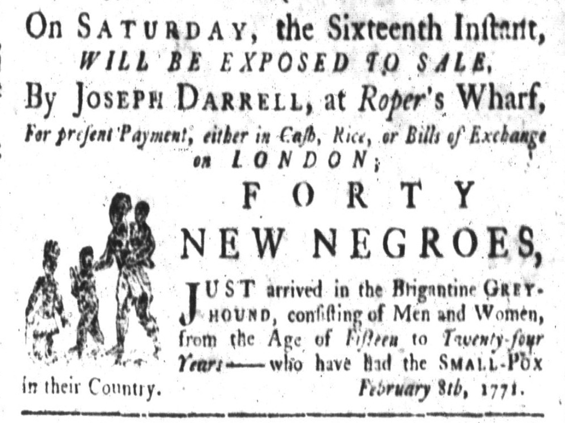I’ve found colonial-era advertisements for the sales of what they called “new Negroes,” or newly arrived enslaved people, at the following wharves (in no particular order): Elliott’s, Motte’s, Mayne’s, Graeme’s, Eveleigh’s, Dandridge’s, Burn’s, and Roper’s. I’m sure I’ve missed a few wharves, but I’m working towards a comprehensive collection of data that matches the sales of newly-arrived slave cargos and specific sale locations. In short, however, I feel confident that we can distill this information down to a reasonably accurate and acceptable summary statement that builds on our earlier conclusion: