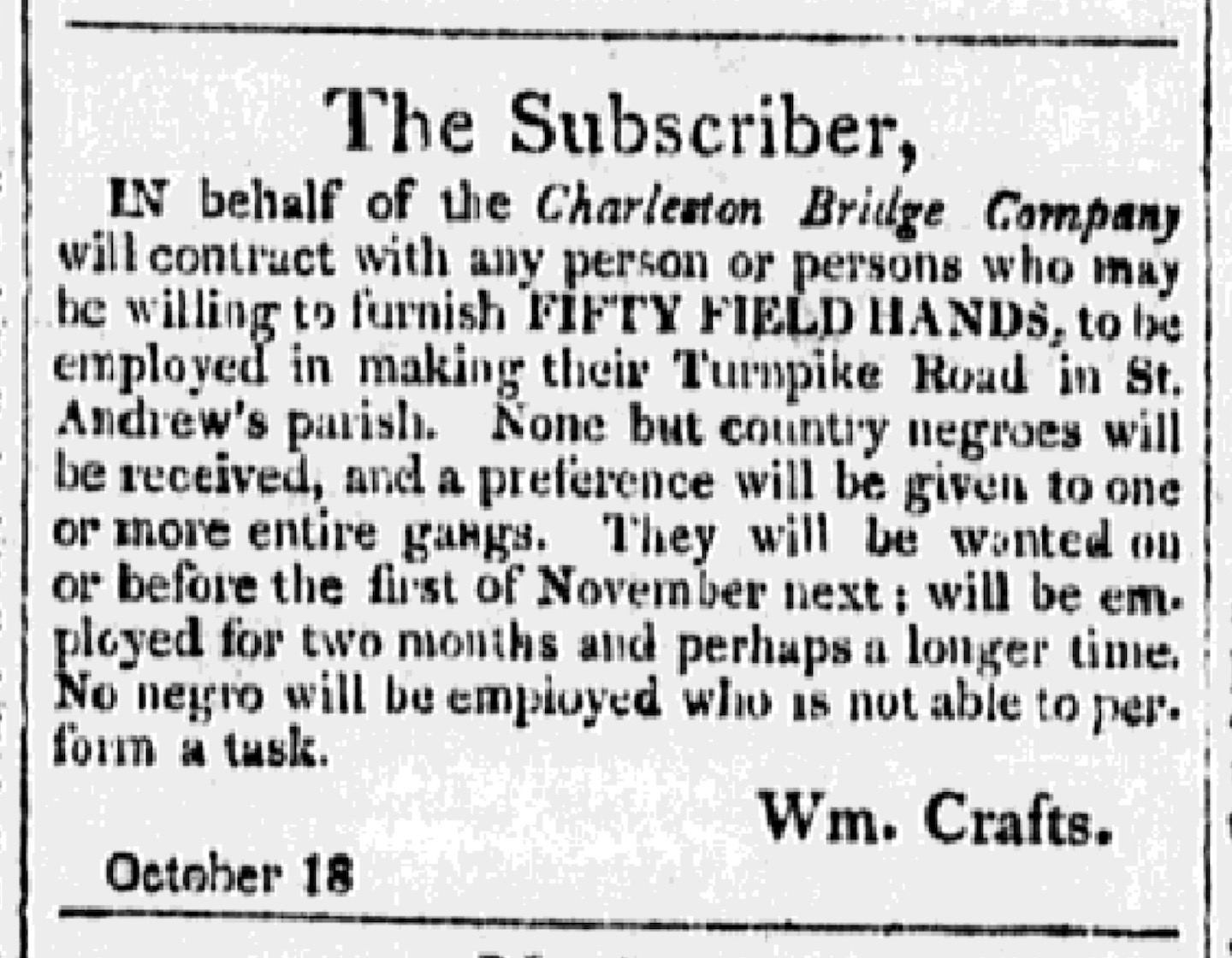 [10] Courier, 27 July 1811, page 3, “St. Andrew’s Turnpike Road”; Courier, 21 November 1812, page 3, “Charleston Bridge Company.”