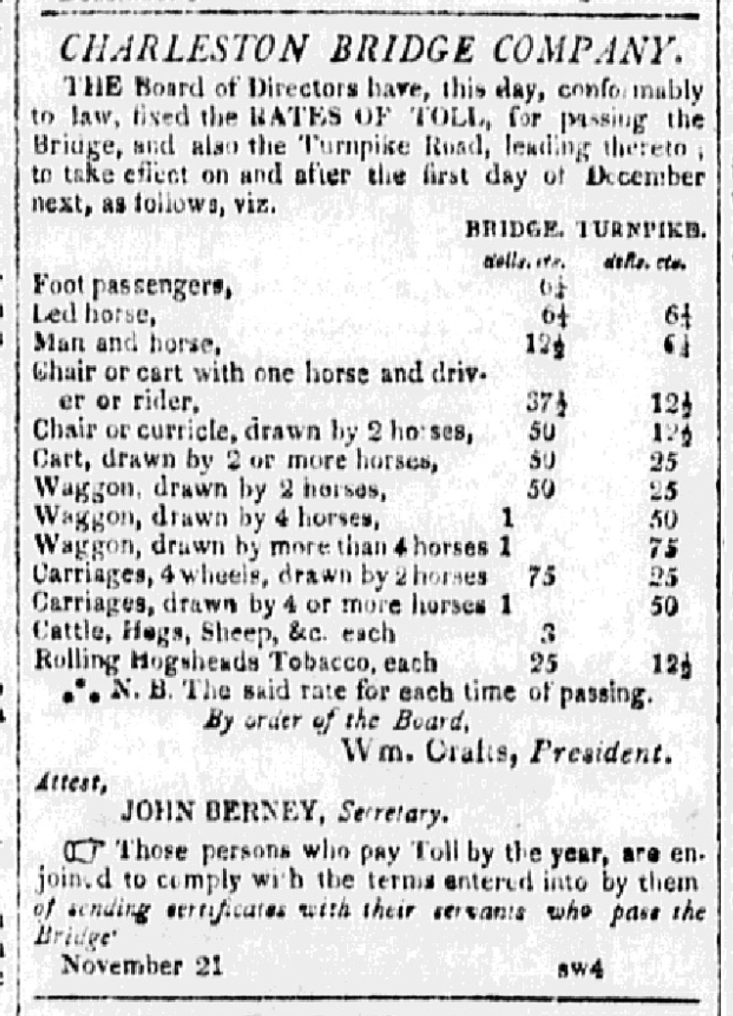 [17] Courier, 21 October 1814, page 2, “Charleston Bridge Ferry. . . For the regulations of the ferry, and the rates of toll, (which are fixed as low as the expences [sic] will admit) apply at the Toll House, to David Ross, Toll Receiver.”