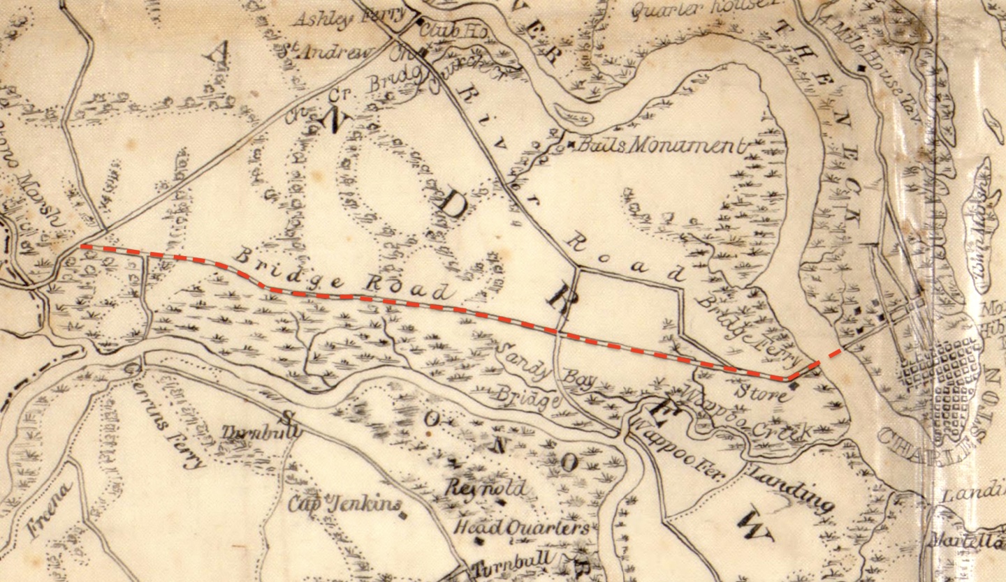 The rumored plan for a new road across the Parish of St. Andrew did not formally surface until the autumn of 1808, when a group of affluent investors petitioned the South Carolina General Assembly for incorporation. The goal of the Charleston Bridge Company, as they called the venture, was to create a bridge across the Ashley River, adjacent to the City of Charleston, with causeways on either side of the river leading to the bridge. The proposed work “would be of great public utility,” said the petitioners, augmented “by the cutting of a road from the end of the causeway to be made in St. Andrew’s Parish to intersect the public road leading to Rantouls [sic; Rantowle’s] Bridge”—that is, from the Ashley River to what is now called Bee’s Ferry Road.[4]
