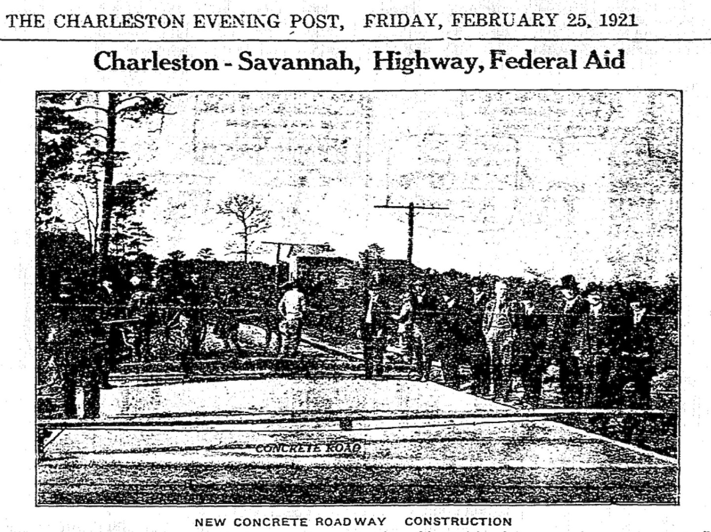 [34] Evening Post, 25 February 1921, page 6, photo under the heading “Charleston-Savannah, Highway, Federal Aid.” The width of the roadway is mentioned in Evening Post, 5 February 1920, page 7, “Much Progress by Drainage Board.” The starting point of the paving is specified in News and Courier, 16 November 1920, page 12, “County of Charleston to Take Over Bridge at the Foot of Spring Street.”