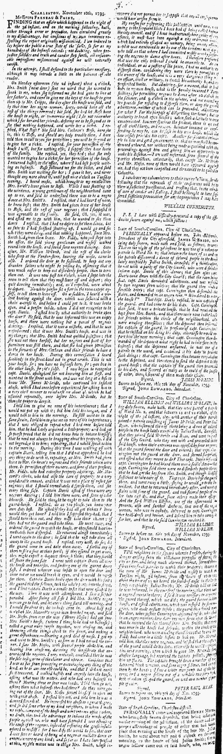 Here, at the end of his long narrative, Mr. Cunnington included the full text of five affidavits sworn by seven white men before Charleston Intendant John Edwards on November 7th, 1795. By publishing his own version of the events in question alongside the sworn testimony of his accusers, William Cunnington was inviting the public to weigh the evidence and to form their own conclusions about what really happened. It was a bold move, motivated by Cunnington’s firm belief that malicious accusations had entirely distorted the truth of his role in both the black dance and the subsequent police raid at Mrs. Smith’s house. Baseless rumors and criminal accusations against him were circulating through Charleston and threatening to spread to the State House in Columbia. To quash the scandalous controversy, William Cunnington unsheathed his most powerful defense—a rational and balanced presentation of the facts.