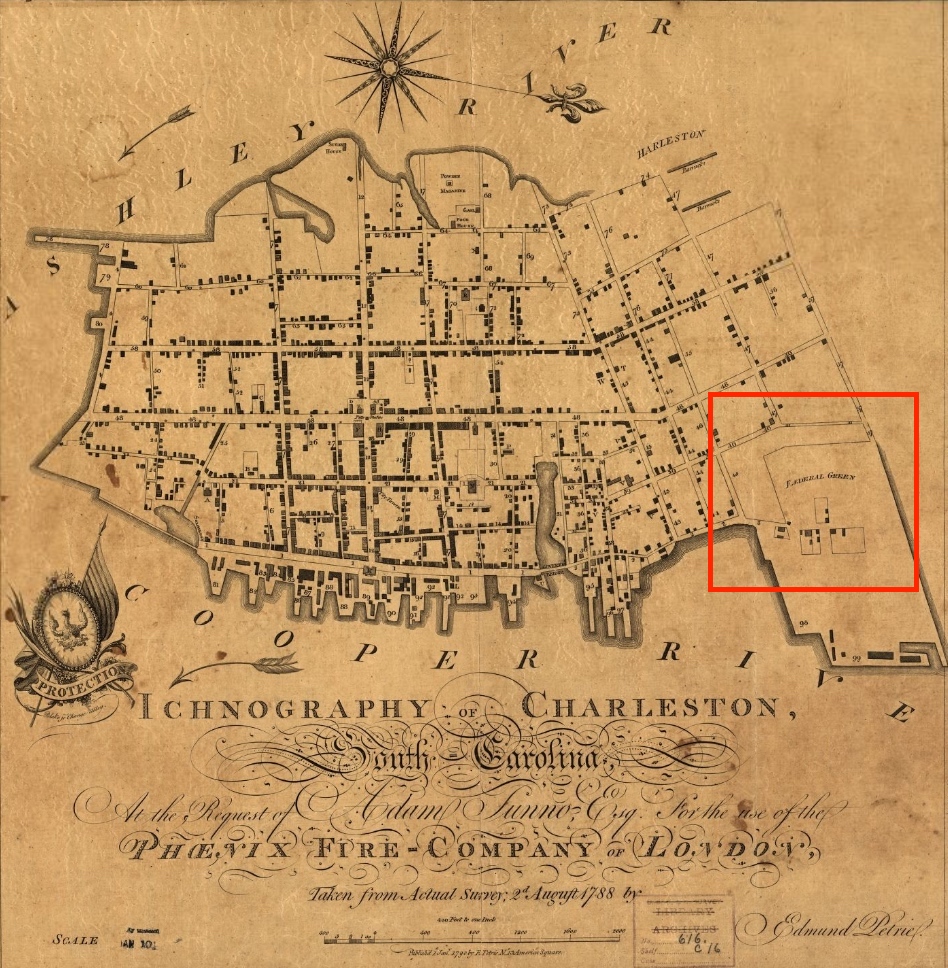 The Wright brothers’ efforts to subdivide the property proved unsuccessful, and in 1756 they re-conveyed the 23.5 acres to Anson’s new Charleston attorney, Richard Lambton. Lambton then sold approximately twenty acres of high land to John Rattray in April 1757, including all of the property located to the east and to the south of an L-shaped brick wall mentioned earlier, all the way down to the edge of the Cooper River. Twelve months later, in April 1758, Rattray conveyed most of this property, including approximately fifteen acres of high land and George Anson’s former residence, to Christopher Gadsden (1724–1805). Gadsden soon developed a massive wharf along the banks of the Cooper River, and, in the years after the American Revolution, subdivided the remaining land in a development called “Federal Green” (which included a “Wall Street”). The remaining four to five acres of Rattray’s property, located north of Society Street, east of Anson Street, and south of the brick wall mentioned earlier, soon became the suburban residence and wharf property of Henry Laurens.