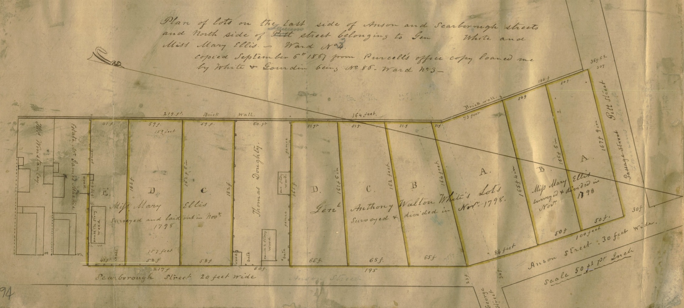 [10] A small collection of papers related to George Hunter’s original survey and plat of the subdivision of Anson’s Bowling Green into Ansonborough, dated January 1744/5 is found at Staffordshire and Stoke-on-Trent Archive Service, Staffordshire Record Office, Records of the Anson Family of Shugborough, Earls of Lichfield, D615/PS/4/4/4. Surviving, later copies of Hunter’s plat uniformly give the date as 1746, however.