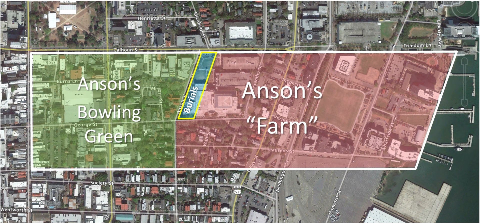 In 1761, sixteen years after commencing to subdivide and sell off parts of his Bowling Green and Farm, George Lord Anson was left holding a balance of approximately three and a quarter acres of high land. This small parcel, which included the site of the graves discovered in 2013, was bounded to the south by John Rattray’s land (soon to be Laurens Street), to the west by Scarborough Street (now part of Anson Street), to the north by a creek that became Calhoun Street, and to the east by the brick wall mentioned in 1754. We have no documentary or physical evidence to confirm that burials had already taken place on this site, but one has to wonder why this small parcel of land was the last remaining undeveloped part of the original much larger tract. By 1761, all of the surrounding lands had been subdivided and sold, and we can now focus our attention on the disposal of this sole remaining lot.
