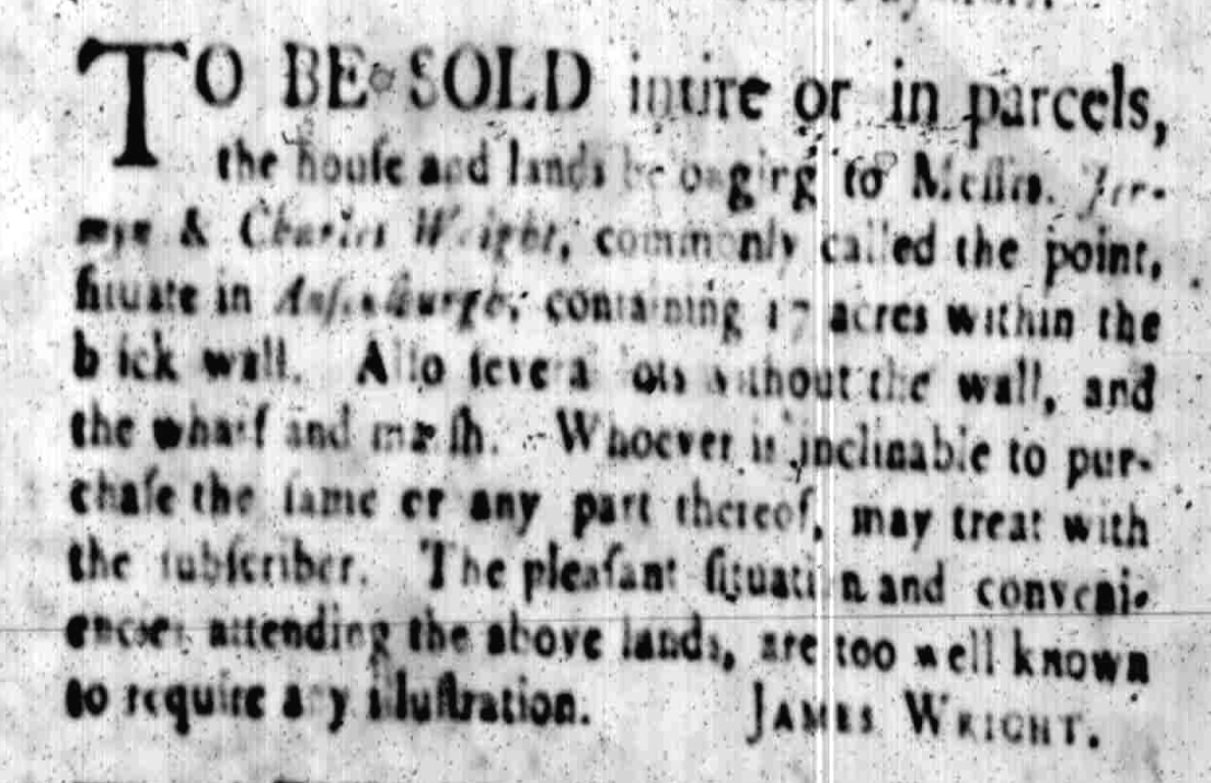 When Charles and Jermyn Wright advertised their desire to subdivide “the house and lands” at this site in 1754, they mentioned the availability of building lots on either side of a “brick wall” that stood east of and parallel to Scarborough Street (now the northern end of Anson Street). In a similar advertisement published in 1756, they offered to sell lots only on the west side of the brick wall, each lot measuring 165 feet between the wall and the east side of Scarborough Street.[11] The lots described in this 1756 advertisement included the land containing the burial ground discovered in 2013. Whether or not there were already some bodies buried at this site in 1756 is unknown, but the references to the presence of a brick wall suggests a possible connection.