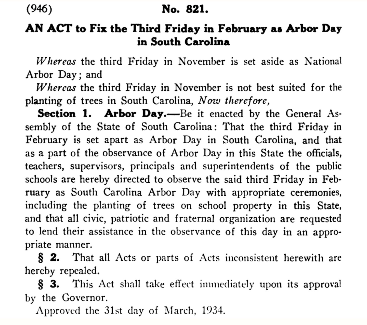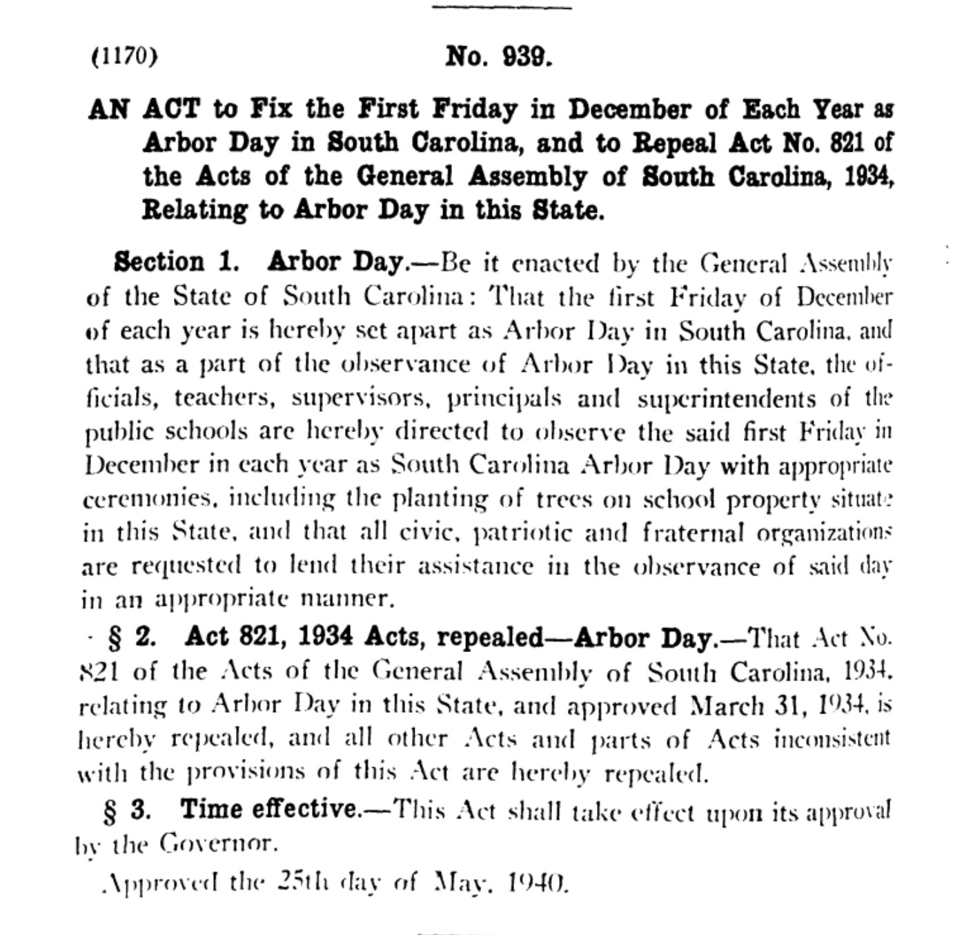[3] “An Act to fix the third Friday in February as Arbor Day in South Carolina,” ratified on 31 March 1934, in South Carolina, Acts and Joint Resolutions of the General Assembly of the State of South Carolina, Regular Session of 1934 (second part of Volume 38 of Statutes at Large), 1422; “And Act to fix the first Friday in December of each year as Arbor Day in South Carolina, and to repeal Act No. 821 of the Acts of the General Assembly of South Carolina, 1934, relating to Arbor Day in this State,” ratified on 25 May 1940, in South Carolina, Acts and Joint Resolutions of the General Assembly of the State of South Carolina, Regular Session of 1940 (second part of Volume 41 of Statutes at Large), 1824.