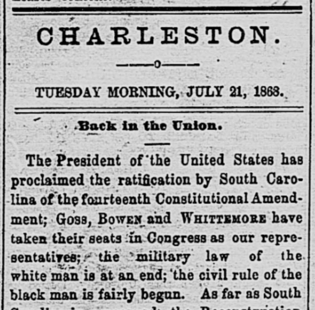 In January 1866, the military commander superintending South Carolina nullified the “Black Code” ratified by the South Carolina legislature just a few weeks earlier. The state legislature attempted to placate Union sentiment by revising the Code later in 1866, but the damage was done, and other egregious political missteps were looming on the horizon. On April 9th, 1866, the U.S. Congress ratified a law that became known as the “Civil Rights Act” of 1866, which formed a major step in securing the legal right to citizenship to all native-born Americans, regardless of their race, color, or former condition. Two months later, on June 16th, 1866, Congress approved the text of a 14th Amendment to the U.S. Constitution and sent it out to the states for ratification. To refresh your memory, the 14th amendment identified all native-born Americans as citizens, endowed all male citizens (age 21 and above) with the right to vote, and promised to all people equal protect under the law. It also barred some classes of ex-Confederates from voting or holding elected office, but that’s another story for another time.