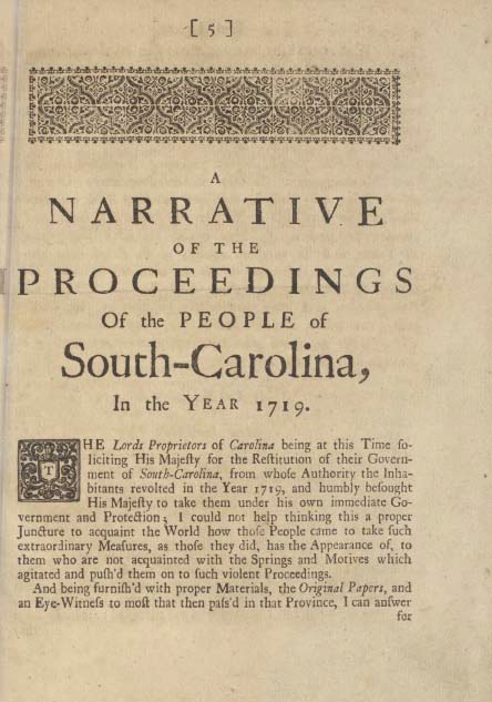 This essay represents an overview of the dramatic events that took place in South Carolina in the final weeks of 1719. My text is based on the facts presented in a number of sources. Francis Yonge’s 1726 publication, A Narrative of the Proceedings of the People of South Carolina, In the Year 1719, provides a valuable first-person overview of those events. Several nineteenth- and twentieth-century historians published admirable descriptions of the Revolution of 1719, including William James Rivers and Edward McCrady, but their works were flawed by a lack of access to important manuscript resources. A cache of manuscript Sessional Papers from the rebel Convention of late 1719 and the early days of 1720 were rediscovered in the 1980s and are now available in digital form from the South Carolina Department of Archives and History. Alexander Moore made extensive use of those manuscripts in his 1991 doctoral dissertation, which you can find on the shelf in the S.C. History Room at CCPL under the title “Royalizing South Carolina.” To this date, Moore’s dissertation represents the most detailed authoritative analysis of the Revolution of 1719 and its aftermath in the 1720s.