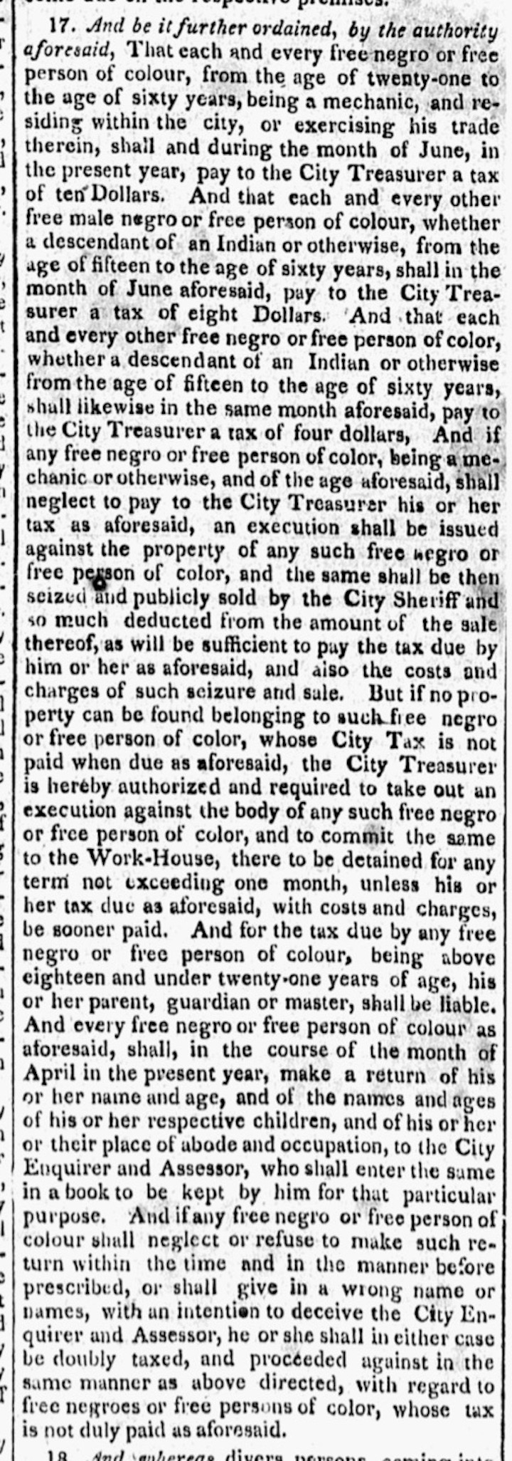 As a corollary to this Charleston practice, it’s worth noting that the city tax ordinance of 1799 introduced an additional obligation on free persons of color. Henceforth, they were required to register annually their name, “place of abode,” and occupation in a specific book at the treasurer’s office. An 1804 revision also required them to list the names of their children, and in 1806 required them to state their age and the ages of their children. Failure to comply with such requirements in 1799 resulted in up to three weeks incarceration at the Work House, but the tax ordinance of 1804 and subsequent years softened this punishment to a doubling of the capitation tax.