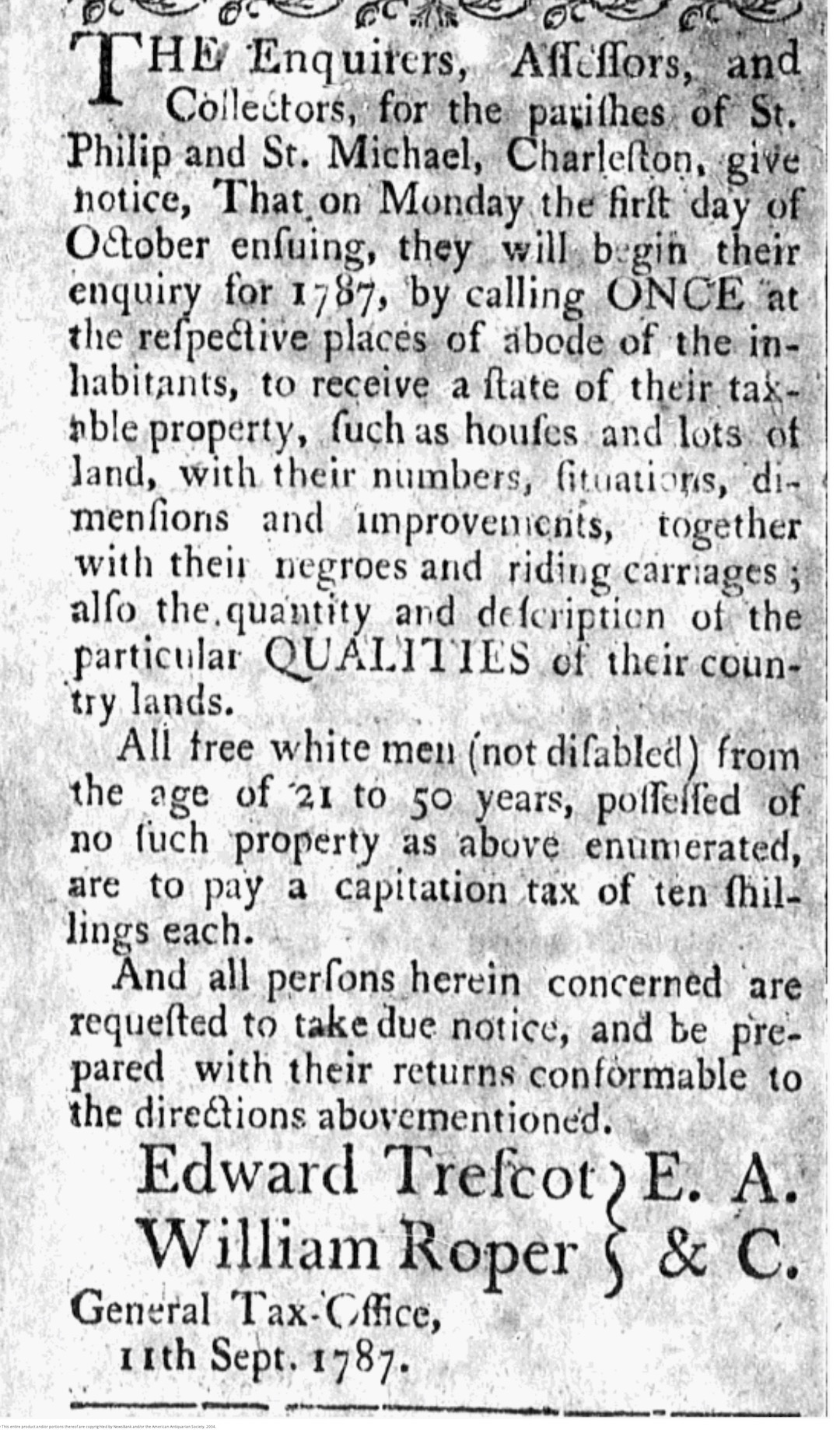 South Carolina’s early tax laws were similar to those in force today. The colonial, then state, and then city governments assessed annual taxes on real property, vehicles, stock-in-trade, professional profits, interest-bearing bonds, and similar valuable assets—including enslaved people—owned by individual citizens. A capitation tax, also known as a “pole” or “head” tax, is an ancient sort of tax of a different character. It refers to a fixed sum levied on individuals without regard to property, income, or other assets. “Head” taxes were often used in the distant past during times of warfare or emergency to raise additional revenue for the local or regional government.