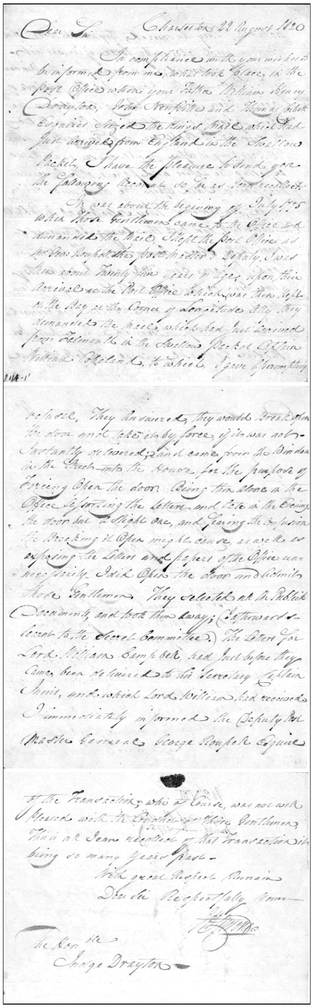 William Henry Drayton personally retained physical evidence of the post office affair in the form of several stolen letters, which were transcribed and published in his son’s Memoirs of the American Revolution (1821). Unfortunately for us, the younger Drayton misrepresented the chronology of his father’s mail pilfering in his Memoirs. Following the flawed testimony provided directly to him by Jervis Henry Stevens in 1820, rather than observing the chronology provided by his father’s notes and documentary evidence, John Drayton described this mail-stealing episode as occurring in early July 1775.[10]