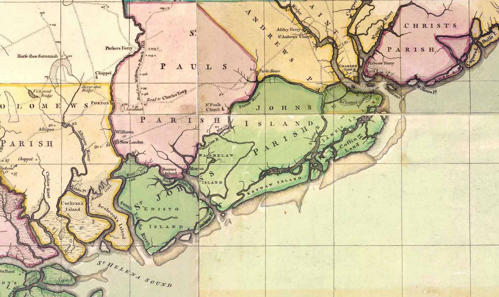 Edisto Island is one of several large sea islands that form the fragmented Atlantic coastline of South Carolina. Located about halfway between the urban centers of Charleston and Beaufort, most of Edisto Island is within the jurisdiction of Charleston County (Edisto Beach is part of Colleton County). The people of Edisto have maintained a strong relationship with Charleston since Europeans first began settling on the Island in the 1680s. In those early years of the Carolina colony, travelers between Charleston and the sea islands were obliged to travel by watercraft. The roads, bridges, and ferries necessary to facilitate an overland trip took many generations to build. For most of recorded history, therefore, travelers between Edisto and Charleston followed a water route.