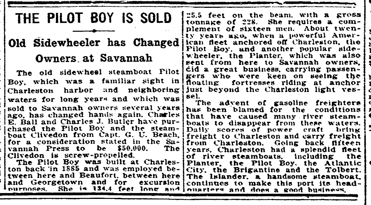 Sept. 26, 1916 notice in the News and Courier that the Pilot Boy had been sold.