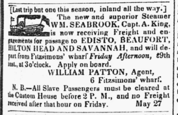 A notice in the May 27, 1840 edition of the Southern Patriot advertises the passage to Edisto on the Seabrook steamer.