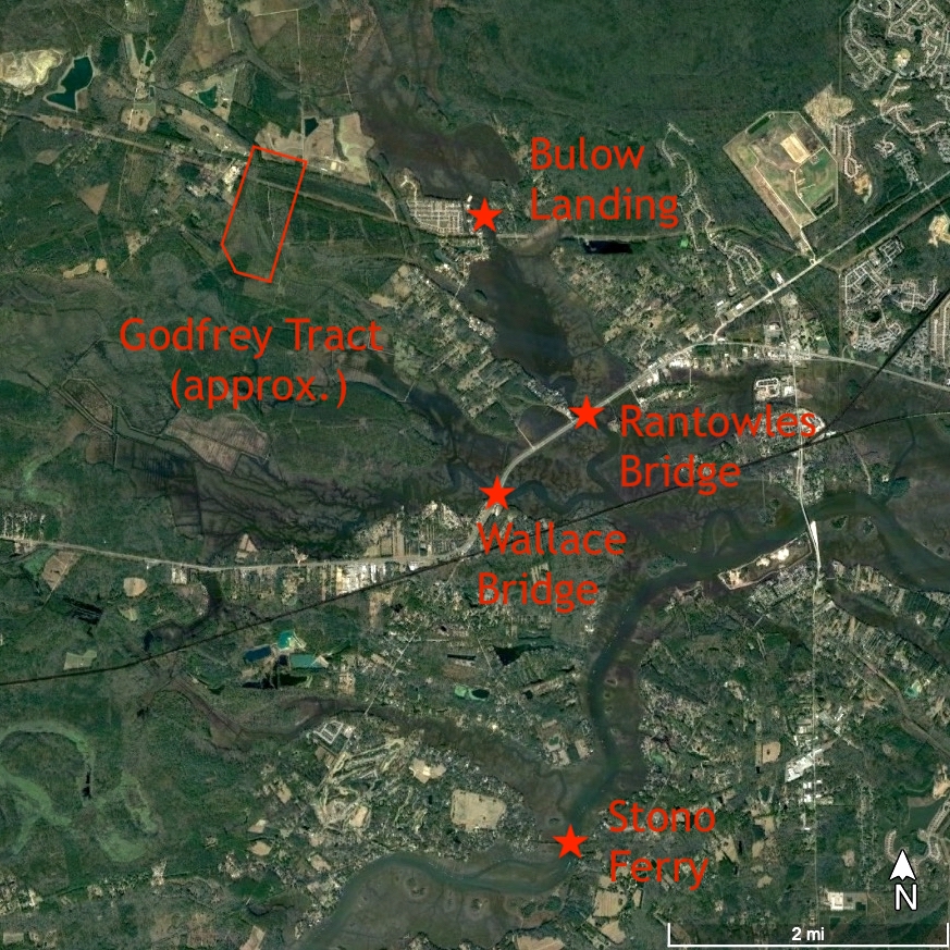 The sprawling Stono River, named after an extinct band of Native Americans (see Episode No. 220), is almost entirely contained within the modern boundaries of Charleston County. During the colonial era, however, parts of the Stono formed the boundaries between two counties and three parishes. The early inhabitants of the Lowcountry described the Stono as having at least five distinct branches, shaped roughly like an elongated letter X. I’ll describe the branches from the Atlantic Ocean to the headwaters, which is opposite to the direction of their flow. The most visible part of the Stono is the southeast branch, which separates John’s Island from James Island, while the southwest branch connects to the Wadmalaw River and helps define that eponymous island. The middle branch of the Stono stretches like an egret’s neck from John’s Island to the northwest, and was sometimes called the northwest branch. At a point just below Wallace’s Tavern and Wallace’s Bridge, the middle branch forks into a pair of smaller tributaries. What we now call Wallace Creek was formerly known as the western branch of the Stono, while modern Rantowles Creek was once called the north or northeast branch of the Stono. Both of those branches subdivide further into numerous fingers to the north and west, which drain fresh water from Caw Caw Swamp and other inland swamps towards the Atlantic.[9]