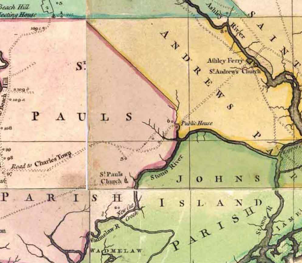 From the creation of South Carolina’s first political divisions in 1682, the various branches of the Stono River formed the boundary between Colleton County and Berkeley County (that is, modern Charleston County). When our provincial legislature created a network of parishes across the Lowcountry in 1706 (as described in Episode No. 203), the Stono formed the boundary between St. Andrew’s Parish to the east and St. Paul’s Parish to the west and south. The broad boundaries of St. Paul’s were trimmed in 1734, however, when the legislature designated the islands on the south side of the Stono River to be the separate Parish of St. John’s, Colleton County.