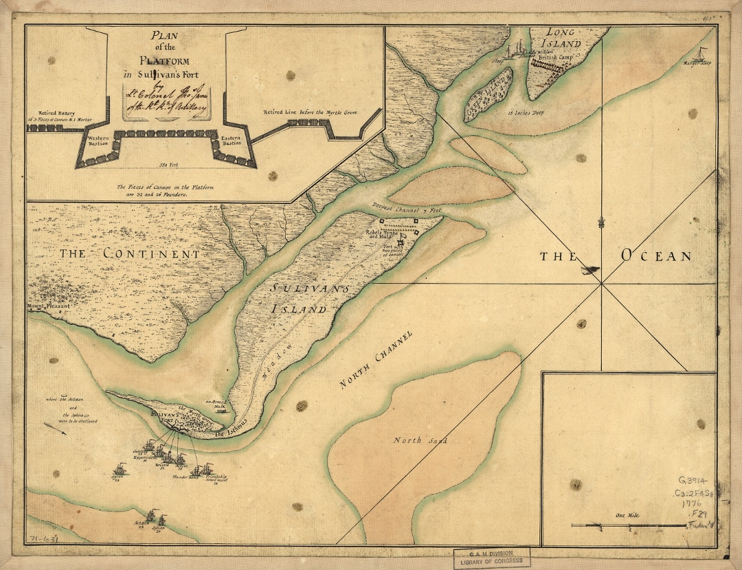 First, let’s time-travel back to the months leading up to the Revolution so we can understand the context of these historic events. In October 1774, representatives from South Carolina joined representatives from other colonies in Philadelphia, where they signed an agreement known as the Continental Association. The delegates pledged to assist each other in the ongoing efforts to negotiate trade and taxation issues with the British government, and to present a unified political front to the mother country. But the situation continued to worsen as the months went by. In early January 1775, most of the elected representatives in South Carolina’s Commons House of Assembly resolved to form themselves into a new, shadow government called the South Carolina Provincial Congress that would work to advance American rights. In late April, the Provincial Congress and a number of political agitators in Charleston created a new entity called the Council of Safety, a sort of executive board for the shadow government. In early June 1775, these two bodies resolved to create a provincial army for South Carolina, to consist of two regiments at first, but later expanded. Our last Royal governor, William Campbell, arrived in Charleston in late June, but by mid-September the tense political climate in Charleston compelled him to sneak out of town and take refuge aboard a British warship in the harbor. In mid-November, two British warships in Charleston harbor exchanged a few shots with an armed vessel representing South Carolina’s nascent navy. When Governor Campbell finally retreated to New York before Christmas 1775, it was clear to everyone in South Carolina that the British would soon return to Charleston with a superior force in an effort to crush the rebellion.