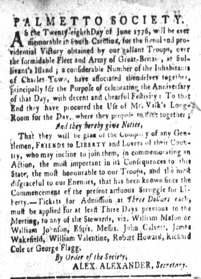 In the months after the important victory at Sullivan’s Island, the winds of war pushed the American struggle for independence northward, and Charleston settled into a brief period of relative peace and prosperity. The significance of the battle on the 28th of June was not forgotten, however. In fact, the relative calm in Charleston allowed men time to reflect on the fortuitous nature of their victory, and they resolved that it should never be forgotten. In May of 1777, a group of men formed a new organization called the Palmetto Society, which was created for one specific purpose: to commemorate “the signal and providential Victory obtained by our gallant Troops, over the formidable Fleet and Army of Great-Britain, at Sullivan’s Island.” In the newspapers of Charleston, the Palmetto Society gave notice of their intention to host a civic feast on the 28th of June 1777, “principally for the purpose of celebrating the anniversary of that day, with decent and chearful [sic] festivity.” Ever the hospitable gentlemen, the members of the new Palmetto Society announced: