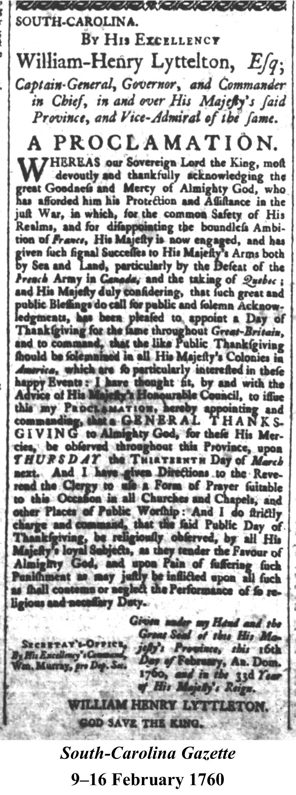 If you’d like to search for evidence of other days of thanksgiving in the early history of Charleston, there are two different ways you could approach the topic. First, you could troll systematically through the surviving records of our early government looking for instances of the governor issuing a proclamation for the public observance of a day of thanksgiving. Before the mid-1800s, however, such proclamations occurred at different times of the calendar year, so there’s no way to predict when days of thanksgiving might have been celebrated. Alternatively, you could start with a list of important events in the history of our community and then consult the surviving records to see if there are corresponding proclamations. For example, days of public thanksgiving generally followed military victories, be they local or distant. In 1745, for example, Charleston gave thanks for the British victory over the French at Cape Breton; in 1776, we gave thanks for the American victory over the British at Sullivan’s Island; in 1815, we gave thanks for the conclusion of a peace treaty with Britain after our “Second American Revolution.” You get the idea. Name an event that impacted the entire community, and in its aftermath, you’re likely to find a proclamation ordering the public to observe a day of thanksgiving.