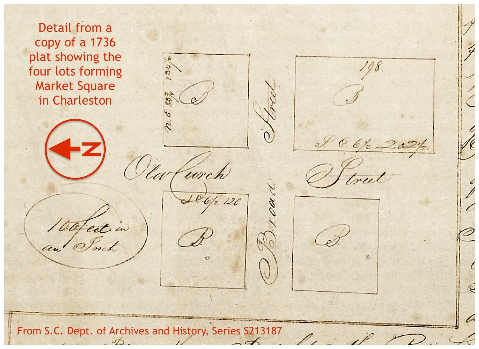 [1] The dimensions of the four quadrants of Market Square appear in a 1736 plat, SCDAH, Copies of Plats and Plans (Series S213187), volume 1, page 8, item 2; and in a survey of the northeast quadrant made on 26 May 1737 in SCDAH, Surveyor’s Notebook for Charleston, 1732–1752 (series S213185), folio 38, recto (page 71).