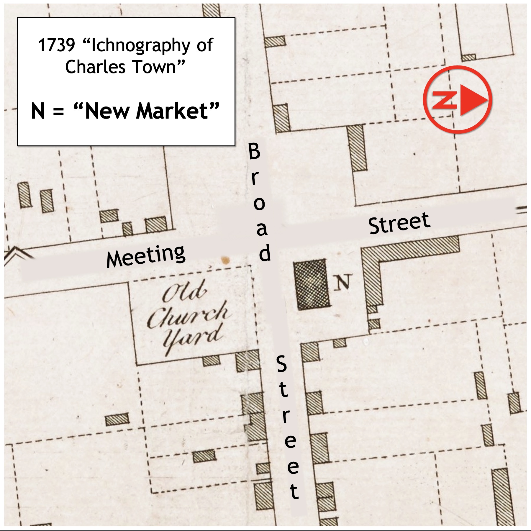 [3] Note that the “New Market” built at the corner of Meeting and Broad Streets in 1735 was distinct from the “New Market” building constructed in 1723 at the intersection of East Bay and Tradd Street, which I described in Episode No. 126. This earlier structure was identified in the 1739 “Ichnography of Charles Town” by the letter “I” as “Court House above & Exchange Below.”