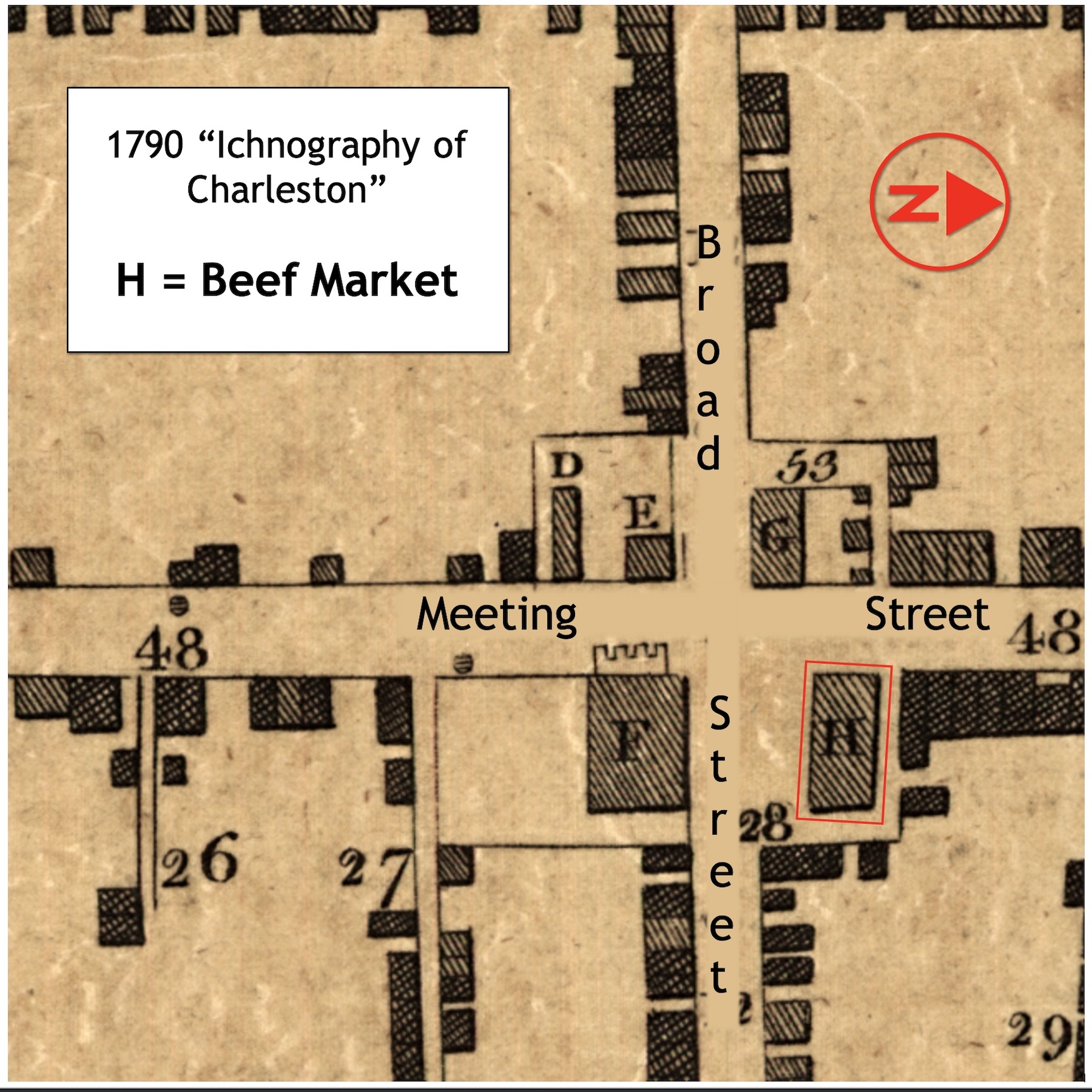 The 1739 “Ichnography of Charles Town” identified the recently-built structure at the northeast corner of Meeting and Broad Streets as the “New Market,” but its name evolved over the years. As early as January 1736, for example, it was called a “Meat Market,” even though it also hosted the sale of fruits, vegetables, and fish.[9] During the 1740s and beyond, it was more commonly known as the “Upper Market” to distinguish it from a smaller auxiliary marketplace standing on a wharf extending from the east end of Elliott Street into the Cooper River.[10] That “Bay Market,” as it was identified in the 1739 “Ichnography,” moved to the east end of Tradd Street in 1750 and became known as the “Lower Market” (we’ll discuss its history in a future program). Finally, the market at the northeast corner of Meeting and Broad Streets became known as the “Beef Market” by 1755, if not earlier.[11] Bovine flesh was not the only commodity sold there, of course, but the vending of beef at the “Upper Market” distinguished it from the Lower Market at the east end of Tradd Street, which sold only “small meats” such as veal, mutton, lamb, pork, and kid in addition to fruits and vegetables. This distinction between the two markets was reinforced in the autumn of 1764, when the Commissioners of the Markets announced that henceforth “all kinds of grain, potatoes, pease and mellons brought to Charles-Town for sale, for the use and consumption of the inhabitants of said town, shall be exposed to open sale within the limits of the Public Market upon the Bay, commonly called the Lower-Market, and not otherwise.”[12] The opening of Charleston’s first fish market at the east end of Queen Street in 1770 further reduced variety of fare sold at the Broad Street market, which was called the Beef Market for the remainder of the eighteenth century.