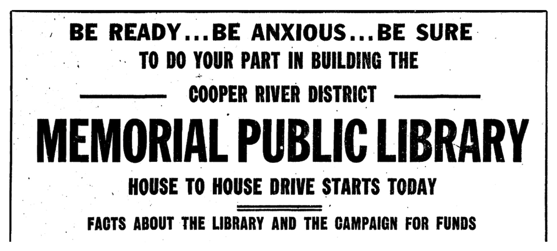 [9] News and Courier, 2 February 1947, page 13, “Memorial Library Campaign Response Reported to be Good”; News and Courier, 4 February 1947, page 7, “Be Ready.”