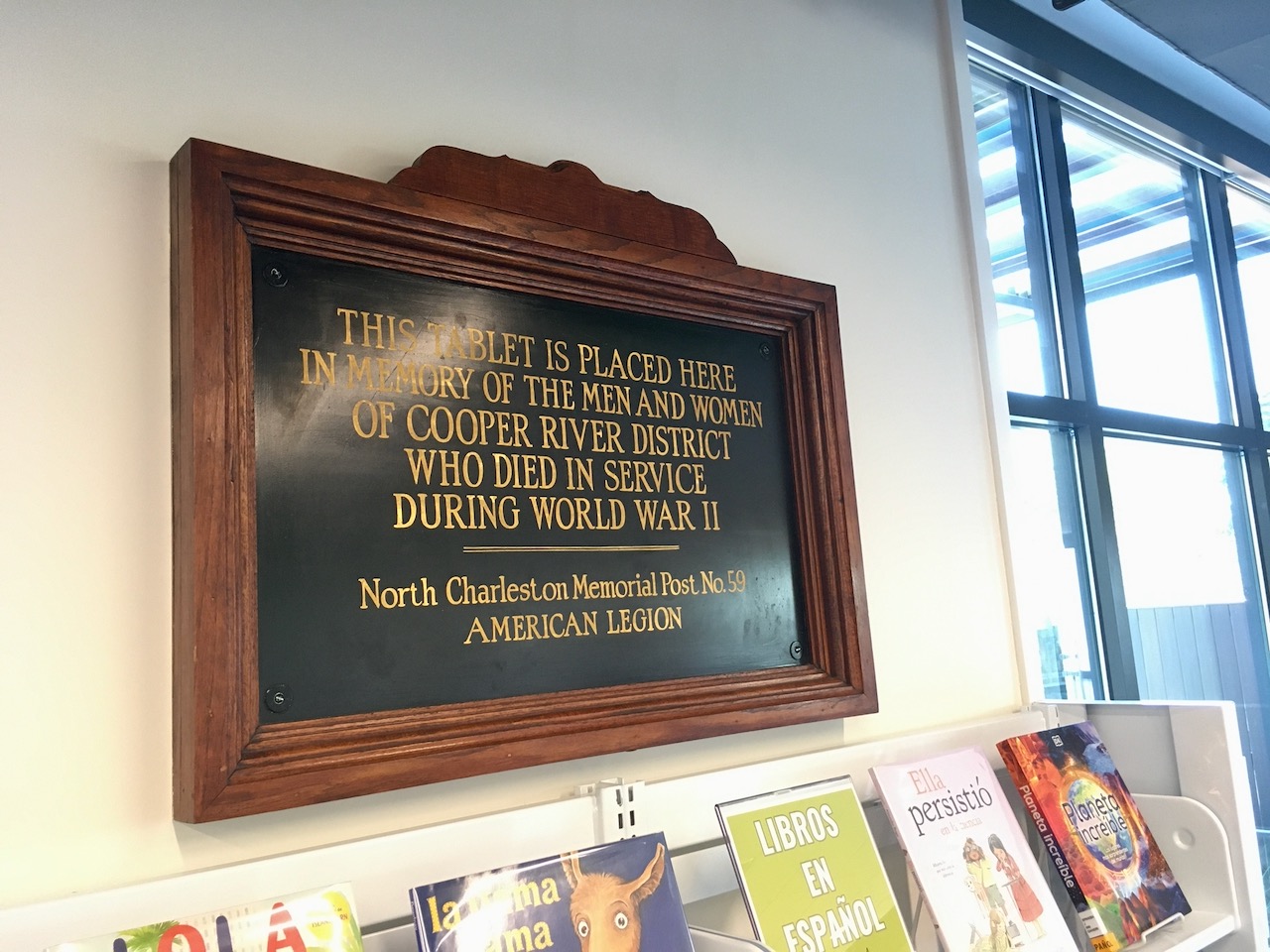 One month after the library’s official opening, officers of the Cooper River District Memorial Library Association and other civic organizations gathered at the new facility to complete their mission. On 23 January 1949, members of the American Legion, North Charleston Memorial Post No. 59, dedicated the building by unveiling an interior tablet inscribed with the following text: “This tablet is placed here in memory of the men and women of Cooper River District who died in service during World War II.”[18]