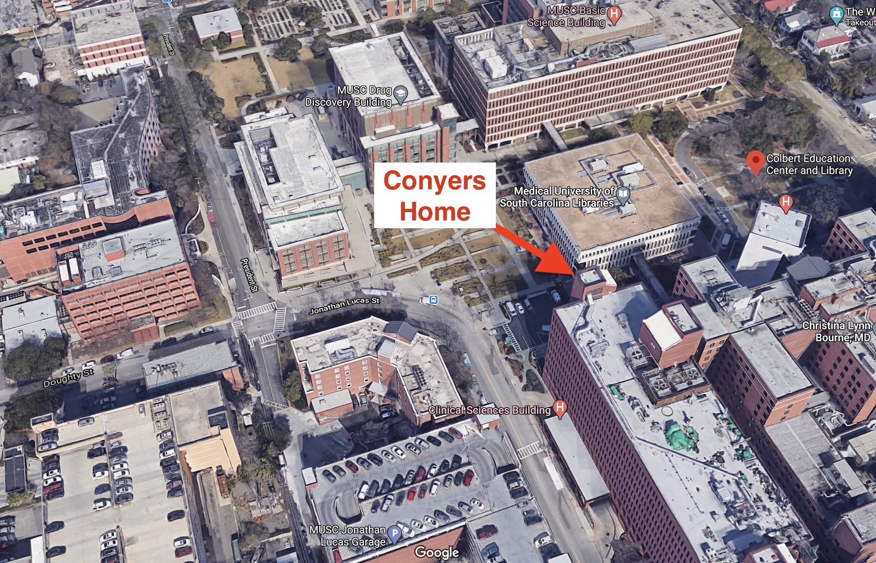 Six years after the death of Fannie Conyers, their family home was razed to make room for a new teaching hospital for the Medical College of South Carolina. In 1949, the college purchased approximately seventy residences and one church forming a vibrant African-American neighborhood bounded by Doughty, Ashley, Mill, and Lucas Streets. After the site was cleared in the late summer and early autumn of 1950, one newspaper heralded the improvement of this “former slum area.” The new teaching hospital for the Medical College opened in the summer of 1955, and fifteen years later the adjacent vacant property was developed into a library and administration building. The Medical College became the Medical University of South Carolina, and its 1971 library was renamed in 2009 as the James W. Colbert Education Center and Library. Beneath the southwest corner of that large structure you’ll find the shadow of the Conyers family home.