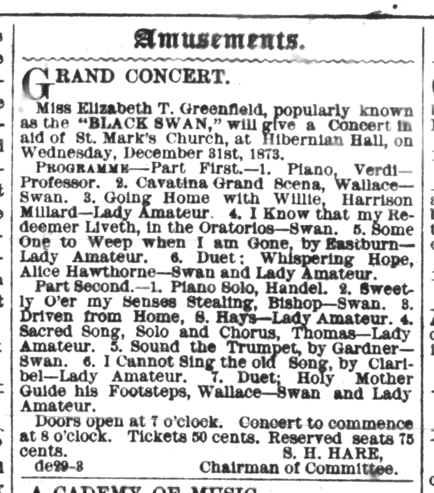 “The Black Swan.—The concert at Hibernian Hall last night for the benefit of St. Mark’s (colored) Episcopal Church was well attended, almost every seat in the hall being occupied. The audience consisted principally of colored people, but there were many whites present, among whom were the governor [Franklin Moses Jr.] and chief justice of the state [Franklin Moses Sr.]. The singing of the ‘Black Swan,’ a colored woman of about fifty-five years old, was very remarkable. She accompanied herself upon the piano, and sung [sic] several difficult songs in as many different voices. The most remarkable part of the performance was the song from the opera of Lurline, which the ‘Black Swan’ sang in a clear, distinct baritone voice, so nearly resembling that of a man as to deceive the hearers. All in all, it was a wonderful performance, and is well worth hearing. The amateur who assisted the ‘Black Swan’ accomplished her part of the programme with such satisfaction to the audience that she was frequently applauded. The amateur is a native of this city, and a dark woman. The ushers were very attentive, and the whole entertainment was a complete success. Another concert will be given this evening.”[13]